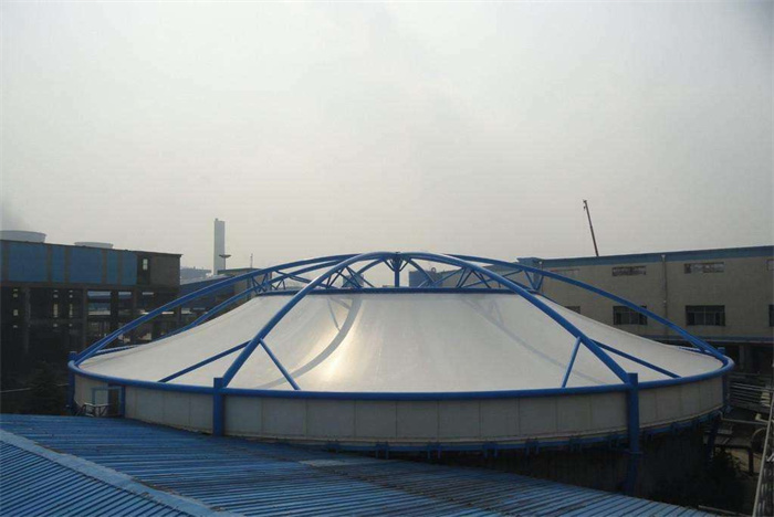 膜结构污水池加盖是一种新型的处理污水池废气的方法,这种方法不仅结构新颖,而且造型优美,安装,维修方便,充分发挥了膜结构建筑的优势。膜结构污水池加盖是以钢结构为主,将膜材反吊的形式进行污水池废气除臭。膜结构污水池加盖作为新型的污水池废气除臭方法,在膜材性能,结构安装和施工方面都具有很大的优势: