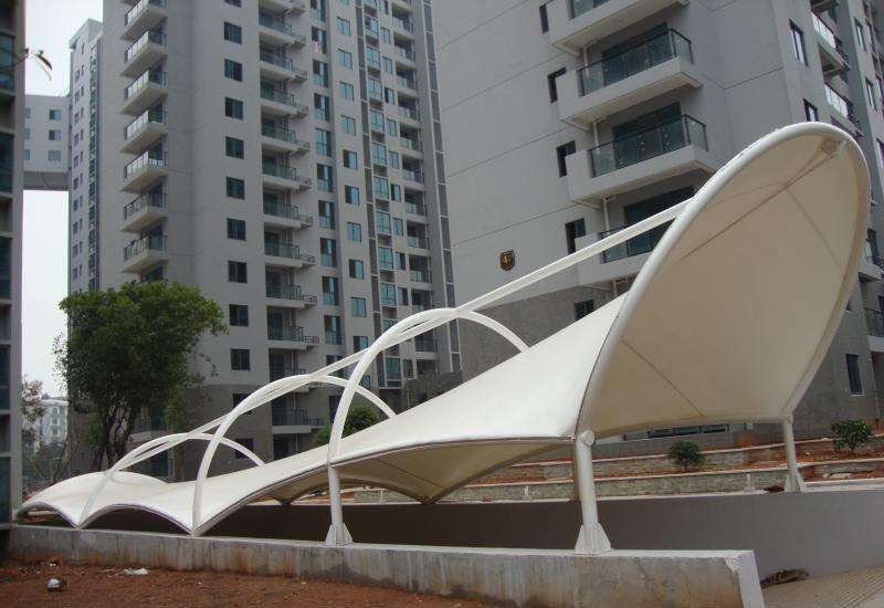 大门膜结构出入口其主要是提供大门遮阳、遮雨功能,并增加大门造型的观赏性、艺术性,其优点主要有:1、造型新颖,创意十足,具有很好的景观效应,提升建筑的整体品质,2、膜材就有很好的抗腐蚀性,耐火性,自重低抗震性能优异,3、膜材具有良好的透光性,可以为大门提供更好的照度,4、张拉膜结构的独特曲面外形使其具有强烈的雕塑感。膜面通过张力达到自平衡。负高斯膜面高低起伏具有的平衡感使体型较大的结构看上去像摆脱了重力的束缚般轻盈地飘浮于天地之间。无论室内还是室外这种雕塑般的质感都令人激动。