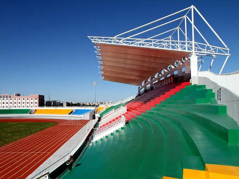 因此很多学校 或者体育场 都会选择张拉膜结构的形式来搭建体育看台,这样不仅可以保证体育看台的美观,还可以达到遮阳 遮雨的效果,后期使用过程中还方便维护,节省人工成本。