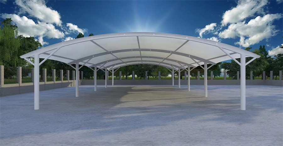 膜结构停车棚,自重轻,具有良好的受力特点——成为大跨度空间结构的主要形式之一。停车场的规划和建设成为现代城市规划的重要组成部分,在以后的建设里会变得越来越重要。膜结构轻巧、别致的造型在停车场及候车厅的建设中担当了重要角色,除了满足防风雨、防日晒等基本功能外,并有较好的标识招揽效果,展现了人们个性化的一面。